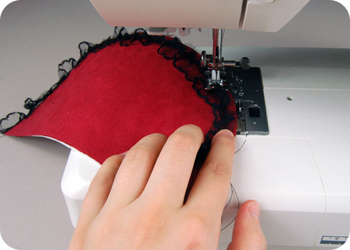 5. With your lace all scrunched up, baste it to the curved edge of your purse flap, lining it up with the raw edge. This will hold it in place while you finish the flap so just a little bit of lace peeks out ^-^