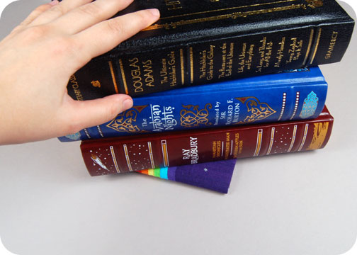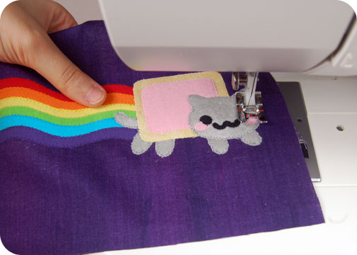 1. The first part is prettifying up your book cover with the Nyan Cat appliqué. Apply your fusible web to your fabric, then arrange all the pieces to form the picture. The guidelines on the pattern will help give you an idea of where to place everything as far as layering goes. This part can be a little headache inducing but it’s also kind of fun :B When all your pieces are properly placed, you can iron them all down.