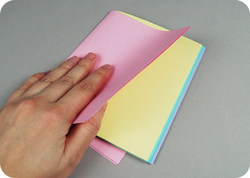 6. Now take all of your smaller sheets and fold those in half again. If you have a bone folder that works out nicely. To create the rainbow effect, layer all your pink sheets into one stack, then do the same with your yellow sheets. Slip your yellow sheets into the middle of the pink sheets. Repeat this with the green, blue, and purple sheets to create the full strata of colors. You should have a full stack of rainbow colors when you finish 😀