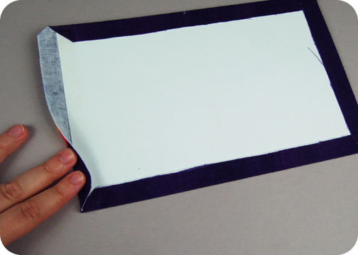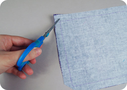 7. Now back to the book cover. We’re about to cover the poster board with the fabric, and the lines I drew from the pattern guidelines indicate where the poster board will go. To make the corners very clean, you’ll want to clip the fabric to get rid of excess bulk. Make sure to clip the fabric within ⅛” of the lines so you don’t clip too far by accident.