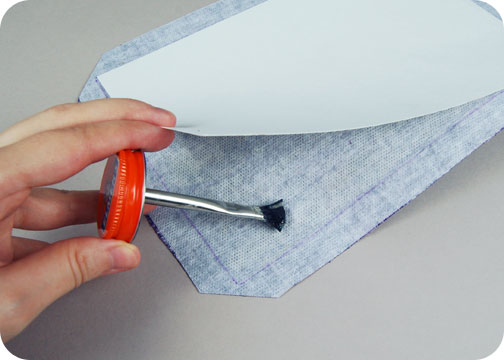 3. To make the next steps easier, you’ll want to reinforce the fabric. Take your interfacing and iron it to the back of your finished appliquéd book cover.