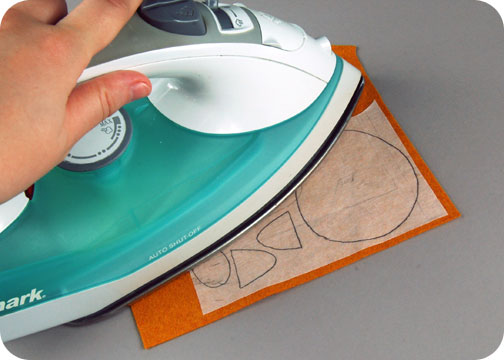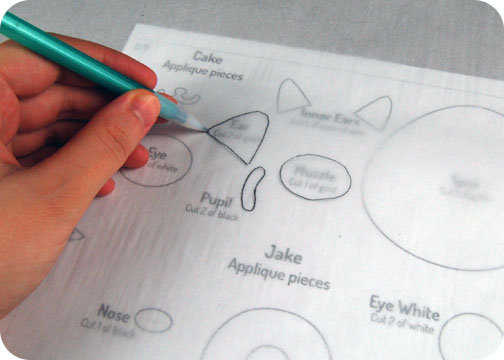 1. The brunt of this project involves the appliqué that goes into making the faces for the characters, so I decided to take this part step by step so there’s no confusion. First you’ll want to take your fusible web and layer it over your appliqué pattern pieces with the glue side facing down, then trace over the shapes you need for the character you’re making. Use lightweight interfacing if you want to sew your fabric pieces in place, or stick with heavy duty interfacing if you want to make life easier on yourself and skip the sewing. You’ll want to group together like colors while tracing to make the next step easier.