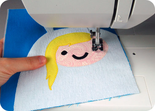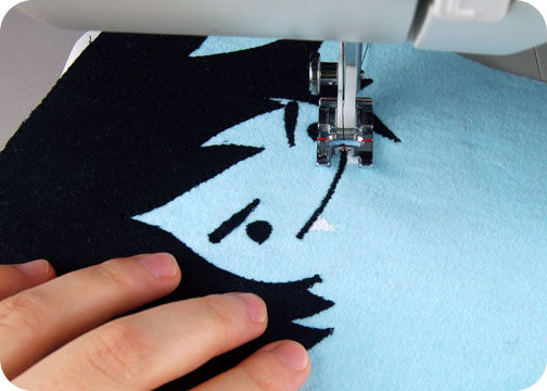 6. Marshall Lee’s face poses one exception, the line needed for his mouth is too small to do with fabric pieces. Draw in the lines for these parts as they’re indicated on the pattern guidelines. In this case I sewed mine on with a satin stitch, but you could also sew it with a straight stitch on your machine, draw it on with a fabric marker, or paint on the lines with fabric paint – no need to get too fussy 🙂 It’s just one line after all, but it’ll pull together the whole look of his face.