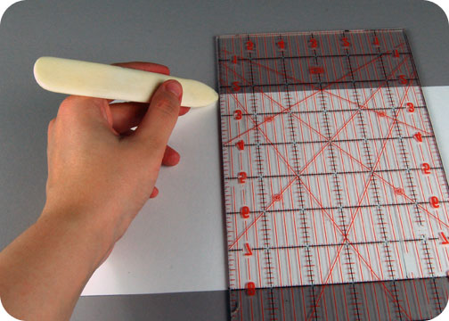 7. Now, onto the body of the book! First we’re making the folds that create the distinct shape of the dos-a-dos binding. From your poster board, create a valley fold and mountain fold along the fold lines indicated in the pattern. I made mine with a bone folder which is a great tool for the job, but any other blunt kind of tool would work well too. When you finish, your book cover should fold up like an accordion (an accordion with just two folds, but an accordion nonetheless).