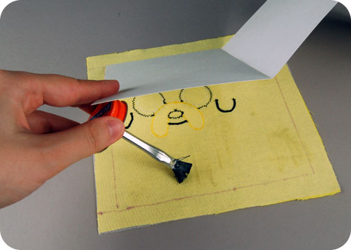 10. Marshall Lee & Marceline also need one more detail to make them complete, and that’s their bite marks. Again, the spots were just too tiny to do in fabric, so I opted to do mine in fabric paint, but a red fabric marker would also do the trick. I bet little French knots done in red embroidery thread would look awesome as well! Either way, make sure your pigment is fully dry before moving onto the next step.