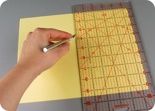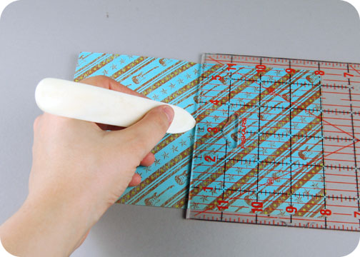 12. To cover up the raw edges of fabric on the inside of your book, we’re adding in a paper lining. This is where you’ll want to break out and fancy paper you might have, such as scrapbook paper or cardstock. Cut it according to the pattern guideline, then score a valley fold down the middle from the right side of the paper.