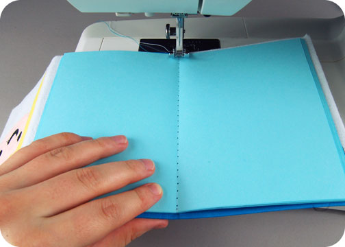 16. Now open up your book pages and make sure the middle crease of all the papers are lined up nicely. Center that crease on the valley fold over your decorative paper book lining. Using your longest stitch length (any shorter and your paper will be perforated), sew down this crease to attach your book pages to your book cover. Go slowly with your machine, as you’re sewing through a lot of layers. Now repeat this with the other side of your dos-a-dos and your second chunk of book papers. Your book is almost done!