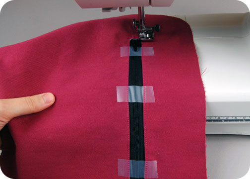 8. With the window complete, you can now add in your 10” zipper. Layer the zipper beneath your outer bag fabric so it’s centered within that little rectangular window. I like to hold my zipper in place with scotch tape, but you could also use fusible web, pins, or even a glue stick to hold it in place while you sew around the edge of the rectangle. Be sure your zipper slider is moved to the middle of the window while you sew.