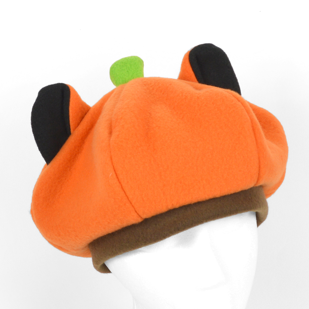 A slightly puffy hat shaped like a pumpkin with kitty ears. Sizes from baby to adult are included.